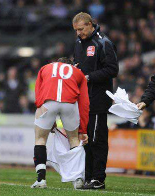 雖然沒有進(jìn)球,但曼聯(lián)10號(hào)極其勇猛,比賽中他在與對(duì)方的一次沖撞中,連球褲也被撕爛。魯尼被迫在邊線外上演一幕現(xiàn)場(chǎng)更換褲子的花絮。從現(xiàn)場(chǎng)畫面看,魯尼不僅球褲破了,連打底的內(nèi)褲也被撕爛,臀部還有明顯的傷痕。功夫不負(fù)有心人,賣力的魯尼終于創(chuàng)造了一次左路傳中,幫助小小羅射入了制勝一球。小小羅進(jìn)球后,魯尼不禁飛身撲到他的背上大吼……