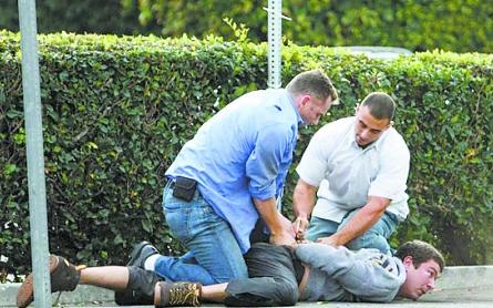 記者顯然不是保鏢的對手,貝克漢姆的兩名保鏢都曾經(jīng)是海軍陸戰(zhàn)隊隊員。他們很快就將記者制服,并專業(yè)地將記者雙手用手銬拷起來壓在地上。直到警察趕到,記者仍然被反拷在地上。記者的相機被一名保鏢直接扔到了垃圾桶內(nèi)。警察趕到后,叫來了救護車,不過當(dāng)事的3人都拒絕接受治療。隨后3人被帶到警察局,不過貝克漢姆已經(jīng)通知律師處理此事! 我們已經(jīng)將事情寫了報告,目前還沒有人遭扣留或起訴。如果需要,我們會繼續(xù)調(diào)查”,比佛歷山警察局發(fā)言人表示。據(jù)悉,記者在當(dāng)時拍攝的畫面已經(jīng)交給警方。