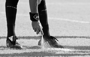 每當(dāng)場上出現(xiàn)犯規(guī)需要處罰任意球的時候,主裁判就可按照國際足聯(lián)《足球規(guī)則章程》的規(guī)定,迅速跑到犯規(guī)地點,在草坪上噴出白色罰球點,然后再到離罰球點9.15米的位置劃出一條白色人墻線,讓雙方隊員和觀眾一目了然。這不但方便了觀眾觀賽,還讓自己的執(zhí)法更加權(quán)威,也讓雙方隊員都能心服口服。當(dāng)然,這種方法也讓人心存疑慮,那就是主裁判能否保證通過步測+目測后劃出的線在9.15米左右。