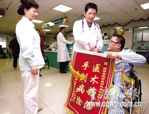 昨天,田曉偉特意將一面錦旗送給了主治醫(yī)生帥杰,以此方式對這位“球迷朋友”表達特別謝意。