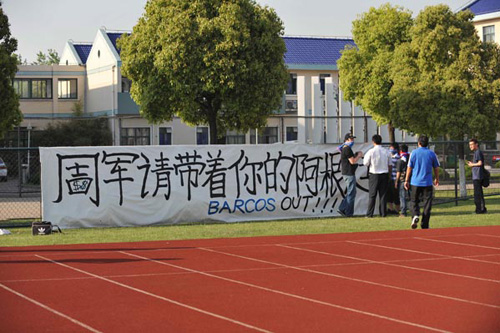 據(jù)現(xiàn)場目擊記者透露,該橫幅上的周字是經(jīng)過球迷改造的,周字中間的口部當(dāng)中出現(xiàn)了兩個(gè)代表美元的符號。據(jù)記者了解,之所以球迷將周軍的周字中間部分做成美元標(biāo)識,是因?yàn)橛蟹婚g傳聞申花的五千萬水貨外援讓其腰包鼓鼓。而橫幅還出現(xiàn)了巴爾克斯的名字,巴爾克斯在申花客場對新加波一戰(zhàn)中雖然攻進(jìn)一球,但是錯(cuò)失多次必進(jìn)球機(jī)會,被認(rèn)為是申花亞冠出局的最大罪人之一,而他恰好是周軍找來的外援。