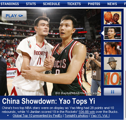 賽后,姚明和易建聯(lián)擊掌致意,這場中國德比也以中國球員的出色表現(xiàn)而收場。而在比賽結(jié)束不久,NBA官方英文主網(wǎng)站在第一時間將易建聯(lián)的頭像放在顯要的位置,并介紹了這場中國球員之間的“攤牌”。