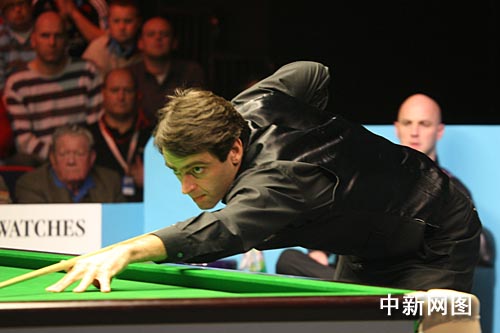 “火箭”奧沙利文在十一日進(jìn)行的斯諾克英錦賽中,不到兩小時(shí)就以九比一大勝對(duì)手馬克·金,輕松進(jìn)入八強(qiáng)。圖為奧沙利文在比賽中。