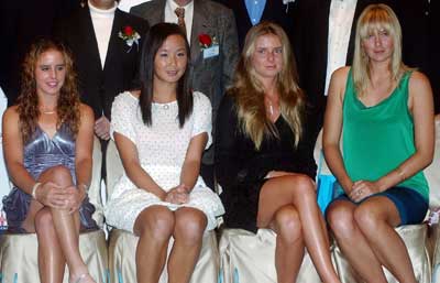 香港網(wǎng)球精英賽昨天在維多利亞公園中央場拉開戰(zhàn)幕。在前晚的賽前酒會上,彭帥和莎拉波娃等人坐到了一起,爭奇斗艷。(左起:彭帥、漢圖楚娃、莎娃)