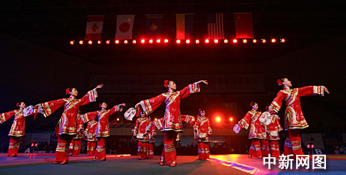 二00八年“全球通”女子摔跤世界杯在山西省城濱河體育中心舉行。山西藝術家熱情地為體育健將們帶來精彩歌舞,使賽場添加幾許短暫輕松。張云 攝