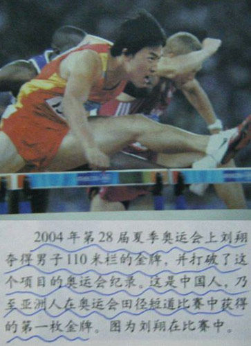 在圖片下附著的文字說(shuō)明這般寫(xiě)道:“2004年第28屆夏季奧運(yùn)會(huì)上劉翔奪得男子110欄的金牌,并打破了這個(gè)項(xiàng)目的奧運(yùn)會(huì)紀(jì)錄。這是中國(guó)人乃至亞洲人在奧運(yùn)會(huì)田徑短道比賽中獲得的第一枚金牌。圖為劉翔在比賽中!