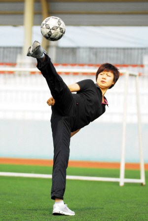 董靜拿了個足球在場上顛,基本上只能顛三四個。立在體育館門前的武術(shù)班教練簡介上寫著,董靜曾獲得過河北散打錦標賽65公斤級冠軍,但讓她參加散打比賽行,讓她控制好這個小小的皮球,卻不容易。美女功夫足球隊名聲在外,真要踢起比賽來,不堪一擊。她們和當?shù)貓F委及一家外企的男隊進行過兩場較量,結(jié)果慘不忍睹。