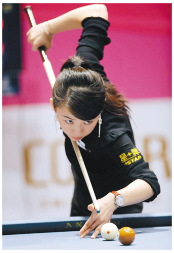 記者讓曉婷給本報讀者簽名問好,她認真地寫下:!渡蜿柸請蟆返淖x者多多關(guān)注臺球運動!支持中國臺球。 辈⒆屑毜禺嬌狭艘粋“9號球”。