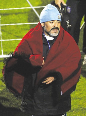當(dāng)阿根廷隊剛剛結(jié)束訓(xùn)練,馬拉多納一行正要返回更衣室,這時兩個來自薩爾塔市(布宜諾斯艾利斯以北的小城)的阿根廷記者走了過來向老馬講述了他們長途跋涉帶來禮物和祝福的故事,馬拉多納本來是快步走向更衣室的,聽到記者的故事立刻停了下來。“這是來自San Antonio de Los Cobres,一個海拔4000米小城孩子們的禮物,他們托我們?yōu)槟銕砹颂鹤!甭牭竭@里馬拉多納的真性情顯露無遺,接過毯子立刻披在了身上。這個被提到的小城叫做 San Antonio de los Cobres,距薩爾塔市約180公里,距布宜諾斯艾利斯約1750公里,海拔高達4000米,那里的球迷無法通過電視來觀看世界杯的比賽,但是他們一樣喜歡馬拉多納,關(guān)注阿根廷隊。許凱 黃啟元 本報南非專電