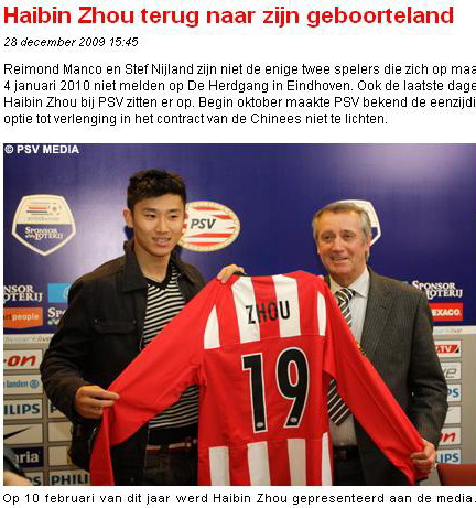 周海濱是今年2月份正式登陸PSV,并在2月17日的一場(chǎng)預(yù)備隊(duì)比賽中登場(chǎng)。雖然未能和周海濱續(xù)約,但PSV官網(wǎng)上還是對(duì)其贊賞有佳:“周海濱是PSV歷史上第二名中國(guó)球員,首位中過(guò)球員是孫祥,他也是第一個(gè)在歐冠賽場(chǎng)上登場(chǎng)的中國(guó)人。雖然周海濱沒(méi)有獲得這也的機(jī)會(huì),但他仍然創(chuàng)造了一個(gè)記錄——他是第一個(gè)在PSV一線隊(duì)進(jìn)球的中國(guó)球員,不過(guò)很遺憾他沒(méi)有代表PSV參加過(guò)正式比賽。”