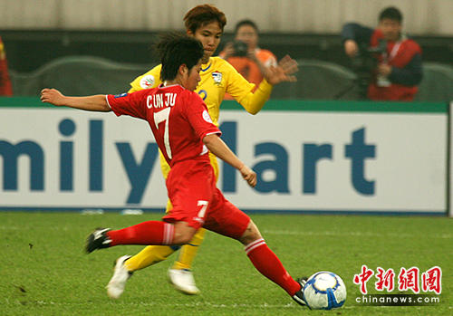 中新網(wǎng)成都5月20日電(記者劉忠俊 劉賢 楊杰)2010年女足亞洲杯A組比賽拉開(kāi)戰(zhàn)幕,亞洲勁旅朝鮮女足迎戰(zhàn)泰國(guó)女足。開(kāi)場(chǎng)4分鐘朝鮮隊(duì)連進(jìn)2球,下半場(chǎng)再進(jìn)一球,以3:0大勝泰國(guó)隊(duì)。