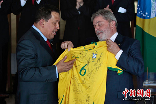 發(fā)展中五國領導人集體會晤2009年7月8日在意大利拉奎拉舉行。會后,代表中國國家主席胡錦濤出席會議的國務委員戴秉國與其他國家領導人一起會見記者。巴西總統盧拉在記者會上送給其他幾位領導人和代表有巴西足球運動員簽名的T恤。 中新社發(fā) 張朔 攝