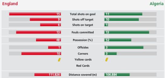 雖然英格蘭隊(duì)有魯尼、杰拉德、蘭帕德、特里等眾多大牌球星,但是他們的控球時(shí)間竟然不如對(duì)手,比對(duì)手低了4%。在越位方面,阿爾及利亞以3次領(lǐng)先于英格蘭隊(duì),可見其進(jìn)攻之心略為強(qiáng)烈。此外,英格蘭隊(duì)全場(chǎng)有10次角球,但都沒有轉(zhuǎn)化成進(jìn)球。