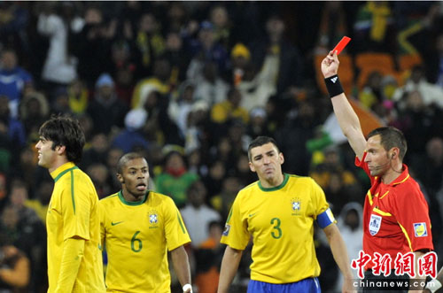 中新網(wǎng)6月21日電 在今天凌晨進行的一場世界杯小組賽中,巴西隊在約翰內(nèi)斯堡足球城球場迎來了第二個對手科特迪瓦。最終憑借法比亞諾梅開二度和埃拉諾的進球,巴西3-1擊敗科特迪瓦。而在比賽進行到第88分鐘時,卡卡因肘擊對方球員,累計兩張黃牌被罰下場。