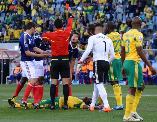 也許失球只是法國隊噩夢的開始,比賽進行到第25分鐘,法國隊攻入南非隊禁區(qū),中場球員、有著“齊達內(nèi)接班人”之稱的古爾庫夫在爭頂頭球時肘部擊中了對手,南非隊隊員就勢倒地不起做昏厥狀。主裁判果斷出示紅牌,將古爾庫夫罰下。