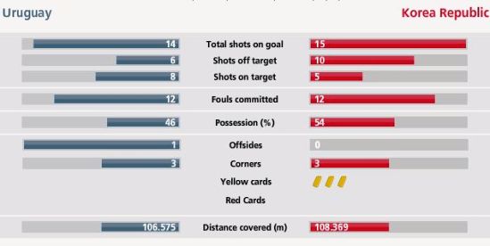 韓國隊(duì)在場上更加咄咄逼人,他們的犯規(guī)次數(shù)和烏拉圭隊(duì)都是12次,但是韓國隊(duì)因?yàn)榍址笇?duì)手吃到三張黃牌。烏拉圭隊(duì)有一次越位,兩隊(duì)的角球都是3個(gè),旗鼓相當(dāng)。