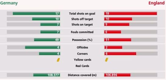角球方面,德國隊(duì)有4個(gè),少于英格蘭隊(duì)的6個(gè),其中英格蘭隊(duì)利用第一次角球的機(jī)會(huì)敲開了德國隊(duì)的大門。