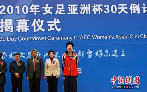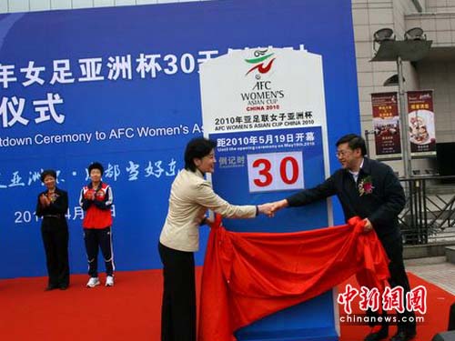 中新網成都4月20日電(記者 楊杰)20日下午,2010年女足亞洲杯30天倒計時揭幕儀式在成都舉行,中國足協(xié)副主席薛立、成都市副市長傅勇林、中國女子足球隊教練陳金剛、中國女子足球隊隊長畢妍,以及泰國駐成都總理事孫建功等出席了揭幕儀式。
