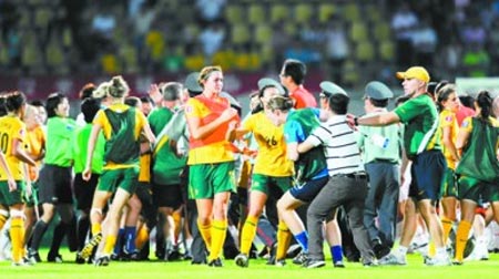 8月3日晚,中國(guó)青年女足在武漢2∶1險(xiǎn)勝澳大利亞隊(duì),亞青賽兩連勝提前小組出線,但在比賽結(jié)束后,雙方發(fā)生沖突,一名澳大利亞球員將中國(guó)球員張?jiān)酱虻,雙方替補(bǔ)球員和教練見狀全部沖到場(chǎng)內(nèi),一片混亂之后,經(jīng)過亞足聯(lián)官員的親自協(xié)調(diào),事件才平息。據(jù)了解,澳球員之所以“發(fā)飆”,是覺得輸?shù)煤堋案C囊”,覺得“中國(guó)隊(duì)做了裁判工作”。路透社的報(bào)道說“這起事件無疑對(duì)中國(guó)足球的聲譽(yù)又是一次打擊。 ”但事實(shí)上,算上上周日中超聯(lián)賽重慶隊(duì)主教練阿里·哈恩的“瘋狂咆哮”,連續(xù)兩次都是外國(guó)教練和外國(guó)球員在中國(guó)綠茵撒野,這里必須要問一句:憑什么?