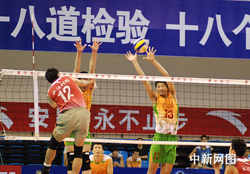河南男排與江蘇男排的冠軍爭奪戰(zhàn)于當日下午4點半準時開始,兩隊悉數派上主力出戰(zhàn)。首局江蘇隊強攻先聲奪人,并一直控制場上局勢,河南隊及時調整戰(zhàn)術,用自己的攔網優(yōu)勢,在第一次技術暫停后追成8:8平并反超比分,江蘇隊隊員毫不示弱,在前國手施海榮的帶領下用強攻屢屢得分,雙方比分交替領先,河南隊在主場觀眾的助威下繼續(xù)發(fā)揮網上優(yōu)勢,有效遏制了對手的強攻,并以25:21先下一城。