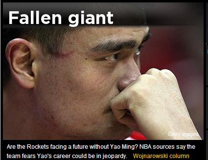 中新網(wǎng)6月30日電 北京時(shí)間今日凌晨,雅虎體育以“巨人的墜落”為題報(bào)道稱:姚明腳踝傷勢(shì)已非常嚴(yán)重,可能缺席下賽季大部分常規(guī)賽。隨后美國(guó)媒體紛紛對(duì)此事發(fā)表評(píng)論。