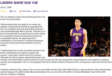 中新網(wǎng)8月1日電 當(dāng)?shù)貢r(shí)間7月31日,NBA上賽季冠軍湖人隊(duì)通過(guò)官方網(wǎng)站,宣布放棄來(lái)自中國(guó)的后衛(wèi)孫悅。