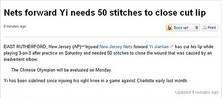 中新網(wǎng)12月7日電 北京時(shí)間昨日,據(jù)美聯(lián)社報(bào)道,易建聯(lián)在新澤西當(dāng)?shù)貢r(shí)間周六早上的一場(chǎng)三對(duì)三訓(xùn)練中被隊(duì)友用手肘打破了上嘴唇。因?yàn)閭麆?shì)嚴(yán)重,竟被縫了50針。