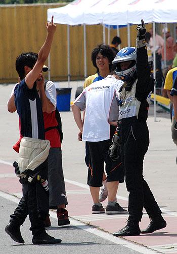 在事故發(fā)生后,韓寒鉆出已經(jīng)面目全非的賽車,用盡全力狠狠地摔了下車門(mén),然后走下賽道。掙扎著駛回賽道的王睿,也在幾圈后遭遇裁判黑旗而退出比賽。當(dāng)王睿將車開(kāi)會(huì)維修區(qū)時(shí),已經(jīng)脫下一半賽服的韓寒,一邊打電話,一邊上前安慰王睿。隨后,兩人非常默契地同時(shí)伸出中指,高高地指向天,并各自轉(zhuǎn)了360度,以便讓現(xiàn)場(chǎng)的更多觀眾和記者看到。此舉立刻引起軒然大波。