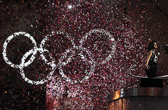 在閉幕式正式開(kāi)始前還有個(gè)小插曲:會(huì)場(chǎng)中央的火炬臺(tái)仍處在開(kāi)幕式時(shí)的“殘缺”狀態(tài)。一個(gè)裝扮成電工的小丑來(lái)到會(huì)場(chǎng),找到了一根沒(méi)有被正確連接的電源線(xiàn),爾后,在小丑賣(mài)力拉動(dòng)之下,那根開(kāi)幕式上沒(méi)有豎起來(lái)的歡迎柱緩緩豎起來(lái)了。開(kāi)幕式上的一個(gè)錯(cuò)誤在今天舉行的閉幕式上被以一種幽默的方式糾正過(guò)來(lái)。