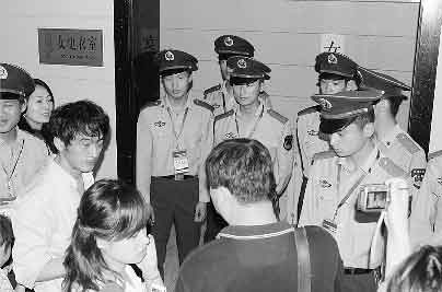 郭晶晶是否真的去找吳敏霞了?這個記者并不清楚,不過據記者了解吳敏霞不出席新聞發(fā)布會是因為害怕被“誤傷”。在郭晶晶第一次離開新聞發(fā)布會現場時,記者也跟了出去。吳敏霞當時剛剛接受完央視的采訪正準備走進更衣室,但此時竟然有一位簽名的男FANS跟著吳敏霞走進了更衣室,不過好在現場武警反應迅速,將他“揪了”出來。見現場形勢已經非;靵y,武警索性集體站在了女更衣室的門口,一位現場工作人員邊打著電話,邊嚷著“守好,誰都不讓進去”。