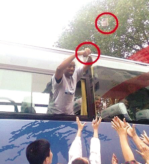 5月23日晚上,湖南湘西某地有關(guān)方面邀請(qǐng)美國體育使者男子明星籃球隊(duì)與立陶宛蘇托瓦職業(yè)男子籃球隊(duì)在該地體育館舉行對(duì)抗賽。賽前,兩支球隊(duì)分別到當(dāng)?shù)氐囊恍┲袑W(xué)進(jìn)行訪問,然而,在5月22日美國體育使者男子明星籃球隊(duì)到市第一中學(xué)訪問時(shí)出現(xiàn)讓人憤怒的一幕,一美國球員在車輛離開校園時(shí)打開窗戶,向圍觀的中學(xué)生撒人民幣,造成現(xiàn)場(chǎng)一度失控。