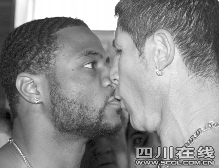 賽前,兩位火爆的拳王互相用口水戰(zhàn)為自己打氣,衛(wèi)冕拳王帕斯卡爾自信地喊道:“我不會(huì)花太長(zhǎng)時(shí)間擊倒他,所以不要來(lái)晚了!辈P(yáng)言要將對(duì)手布蘭科打成“血醬”。隨后,帕斯卡爾還挑釁地同布蘭科鼻對(duì)鼻的對(duì)峙,不過(guò),由于兩人挨得太緊、過(guò)于“親密”,讓火藥味十足的對(duì)峙變成嘴對(duì)嘴的曖昧,讓人忍俊不禁。記者陳甘露