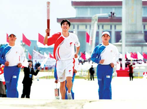 邁著“冠軍步伐”,以慢于任何一次跑步練習(xí)的速度緩慢前行,昨天上午11時(shí)50分,在北京2008年奧運(yùn)會(huì)圣火歡迎儀式暨火炬接力啟動(dòng)儀式上,火炬手代表、中國(guó)著名運(yùn)動(dòng)員劉翔從胡錦濤主席手中接過(guò)“祥云”火炬,跑過(guò)金水橋,成為奧運(yùn)火炬接力中國(guó)境內(nèi)第一人。