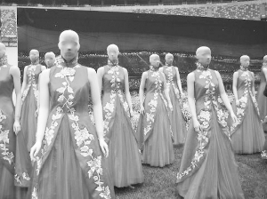 2008奧運(yùn)會(huì)、殘奧會(huì)開閉幕式服裝道具展日前在鳥巢舉行,但模特的造型很“雷人”,清一色以肉色絲襪蒙面,很像劫匪。每個(gè)模特腳下都堆疊著沙包,但堆得亂七八糟。