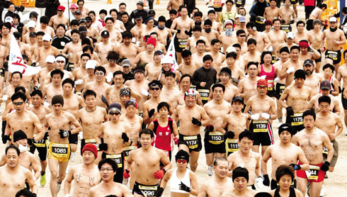 中新網(wǎng)1月5日電 據(jù)朝鮮日?qǐng)?bào)中文網(wǎng)報(bào)道,4日上午,在韓國(guó)大邱舉行的“第2屆新年裸跑馬拉松大會(huì)”上,參與者們不顧寒冷的天氣,正在盡力向前進(jìn)。