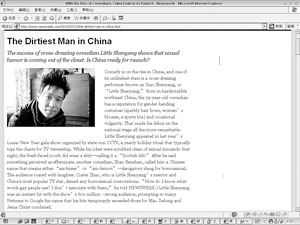 《新聞周刊》回顧了小沈陽參加去年中央電視臺春節(jié)聯(lián)歡晚會的情景說,那天晚上,他抖的“包袱”里雖然沒有黃段子,但這名新人還是穿了一條裙子——蘇格蘭裙。在這臺晚會的6億多觀眾面前,小沈陽一炮走紅。成千上萬的網(wǎng)民去網(wǎng)絡(luò)上搜索他的資料,他的點擊率一下子超過了很多中國名人。