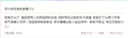 最近福建兩位記者因揭露“紫金礦業(yè)”,結(jié)果在同一天兩位記者的車子同時被撞。李小冉尤其關(guān)注這則新聞,她在昨日中午的微博中發(fā)飆:“天災(zāi)就夠叫人無奈的了,人禍也是沒完沒了!彼 在微博中爆粗口,引來粉絲圍觀,認(rèn)為其有損形象。
