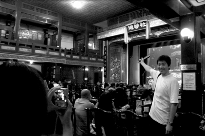 晚上7點(diǎn)半,演出正式開始,德云社元老邢文昭先生表演單口相聲《文昭關(guān)》。此時(shí)上座率剛剛過半,觀眾都很安靜地聽相聲,邢先生抖包袱后,大家也是試探著“噫”了幾聲,反倒是邢先生挺放得開,“叫好就痛快點(diǎn)”。德云社門前停著于謙的座駕,但在后臺(tái),記者沒有看到他和郭德綱的身影。
