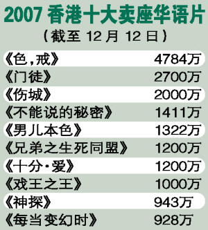 臨近年底,電影界又到了總結(jié)之時。前日,香港影業(yè)協(xié)會公布了今年香港電影的票房情況:因?yàn)榻?jīng)濟(jì)回升,香港電影也隨之升溫,全年票房有望超過10億港元,而僅《色,戒》一片就以近5000萬的票房,撐起了華語片的半邊天。