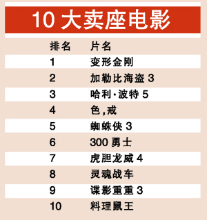 今年臺灣地區(qū)電影市場賣相強(qiáng)勁,是好萊塢續(xù)集片當(dāng)?shù),但包括《加勒比海盜3》、《哈利·波特5》、《蜘蛛人3》、《虎膽龍威4》、《諜影重重3》都是續(xù)集片。還好有《色,戒》為華語片爭光,擠進(jìn)10大。該片在美國被列為NC-17級,票房雖然僅430萬美元(約3170萬人民幣,下同),但在香港票房近5000萬元,臺北市票房約3400萬元,臺灣地區(qū)約6500萬元,締造李安個人最高票房紀(jì)錄。