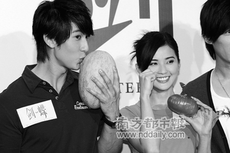 昨天下午,《劍蝶》劇組在北京舉行媒體答謝酒會,導(dǎo)演馬楚成率阿SA、吳尊、胡歌等主創(chuàng)亮相!秳Φ芳磳⑶,答謝會也成了劇組人員的告別宴,劇組準備了一筐蔬果做告別禮物,阿SA和吳尊給對方挑的禮物,讓人不禁啼笑皆非。