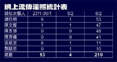 發(fā)放者先于昨日凌晨約1時(shí)30分傳出一張疑似顏穎思的淫照,直至昨午1時(shí)半,共210張淫照以zipfile(壓縮檔)形式經(jīng)電郵傳出,其中疑似鍾欣桐的照片最多,達(dá)53張(見(jiàn)表)。前晚開(kāi)始更陸續(xù)有網(wǎng)友聲稱(chēng)看過(guò)一段約32分鐘有關(guān)陳冠希與一名女藝人的短片。