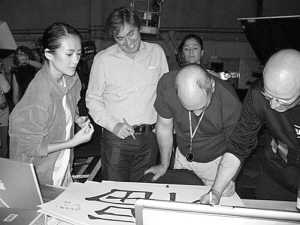 章子怡(左)向各國影人介紹四川地震災(zāi)區(qū)的情況
