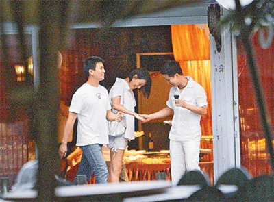 Mike左手(右)拿著紅酒,右手摸著賈永婕的手,似乎想沾懷男胎好運。
