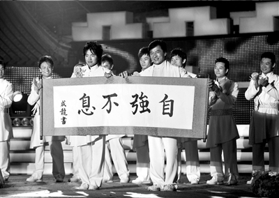 成龍勉勵親傳弟子涂圣成(左二)自強不息。張偉攝
