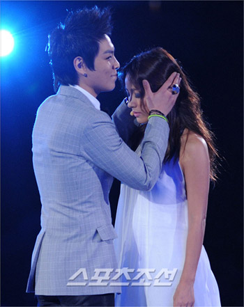 據(jù)體育朝鮮報道,15日晚7時,在首爾蠶室室內體育館舉行的“2008 Mnet-KM音樂節(jié)”( 以下簡稱“MKMF”)上,李孝利和T.O.P在共同演繹《謊言》時,表演了兩個嘴唇互碰的熱吻場面。
