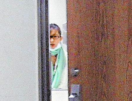 林父病房半掩,林志玲照鏡子,神情憔悴。
