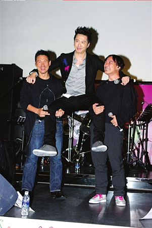 發(fā)布會現(xiàn)場,心情不錯的庾澄慶經(jīng)常大笑得前仰后合,張學(xué)友和陳奕迅更是讓他興奮不已。兩位好哥們兒送上大包的零食,祝福庾澄慶在香港更加“吃得開”。在哥兒仨開唱之前,張學(xué)友特別提醒眾人:“請大家注意歌詞!扁壮螒c哭笑不得地唱起了《愛你的只有一個我》,張學(xué)友和陳奕迅一邊和聲一邊搞笑地伴舞。拍合影的時(shí)候,張學(xué)友和陳奕迅合力把站在中間的庾澄慶扛上肩膀,張學(xué)友還不忘問道:“這下心情好很多了吧?”再三被追問如何對待妻子伊能靜的“外遇”,庾澄慶說:“處理完之后會告訴大家的。”至于是否擔(dān)心這個時(shí)候推出新碟會被質(zhì)疑借機(jī)炒作,庾澄慶表示:“我不會拿家里的事情做新聞點(diǎn),更何況這件事情很重要。如果我不工作把自己關(guān)在家里,就是很好的解決方式嗎?不是! 記者 朱雅清
