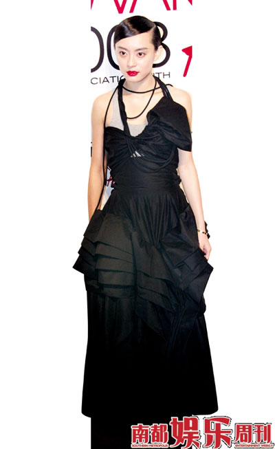 她出現(xiàn)的時候,腳下有一條電線,令人忍不住聯(lián)想這與她領子上那幾條可疑的細帶有什么關系。她面無表情,猶如蠟像館的人偶,也許她被勒著了。裙子也許很好看,但孫儷并不喜歡,她在裙子里配了一件白色的BRA,這種搭配叫做:當純情女星遇上性感裙子。