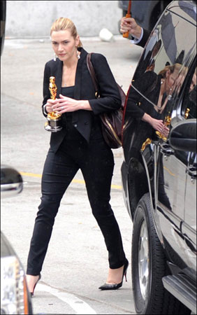 凱特·溫絲萊特對于自己的奧斯卡影后的稱號也是相當(dāng)激動(dòng),下面小編給大家?guī)硪唤M圖片,大家可以看到,影后拿著小金人一直不肯撒手,生怕碰壞,可以看得出她是多么重視這個(gè)獎(jiǎng)項(xiàng)了吧。順便說一下影后的穿著,一身黑色職業(yè)性濃厚,干練的盤發(fā)透出影后的氣勢。